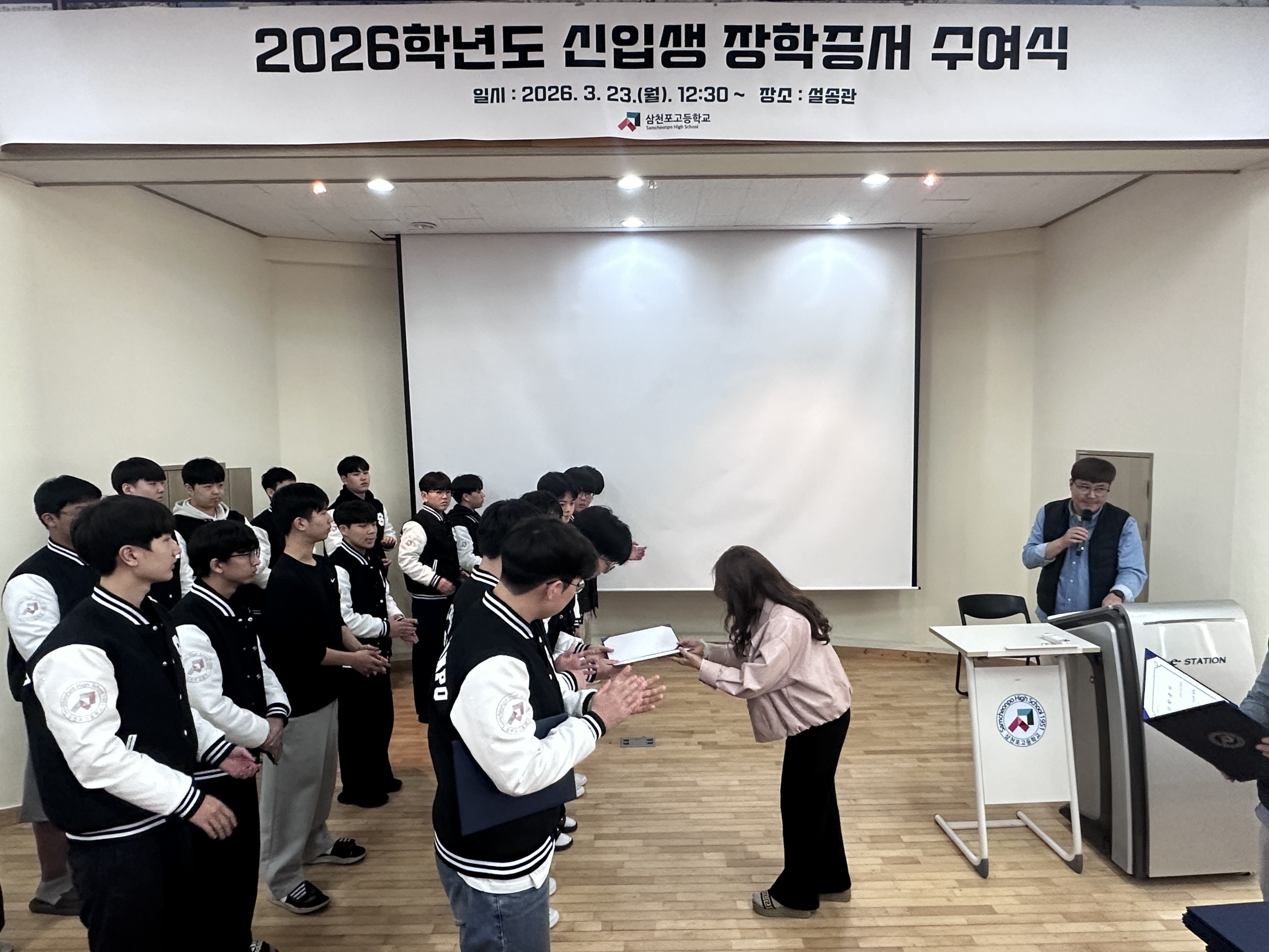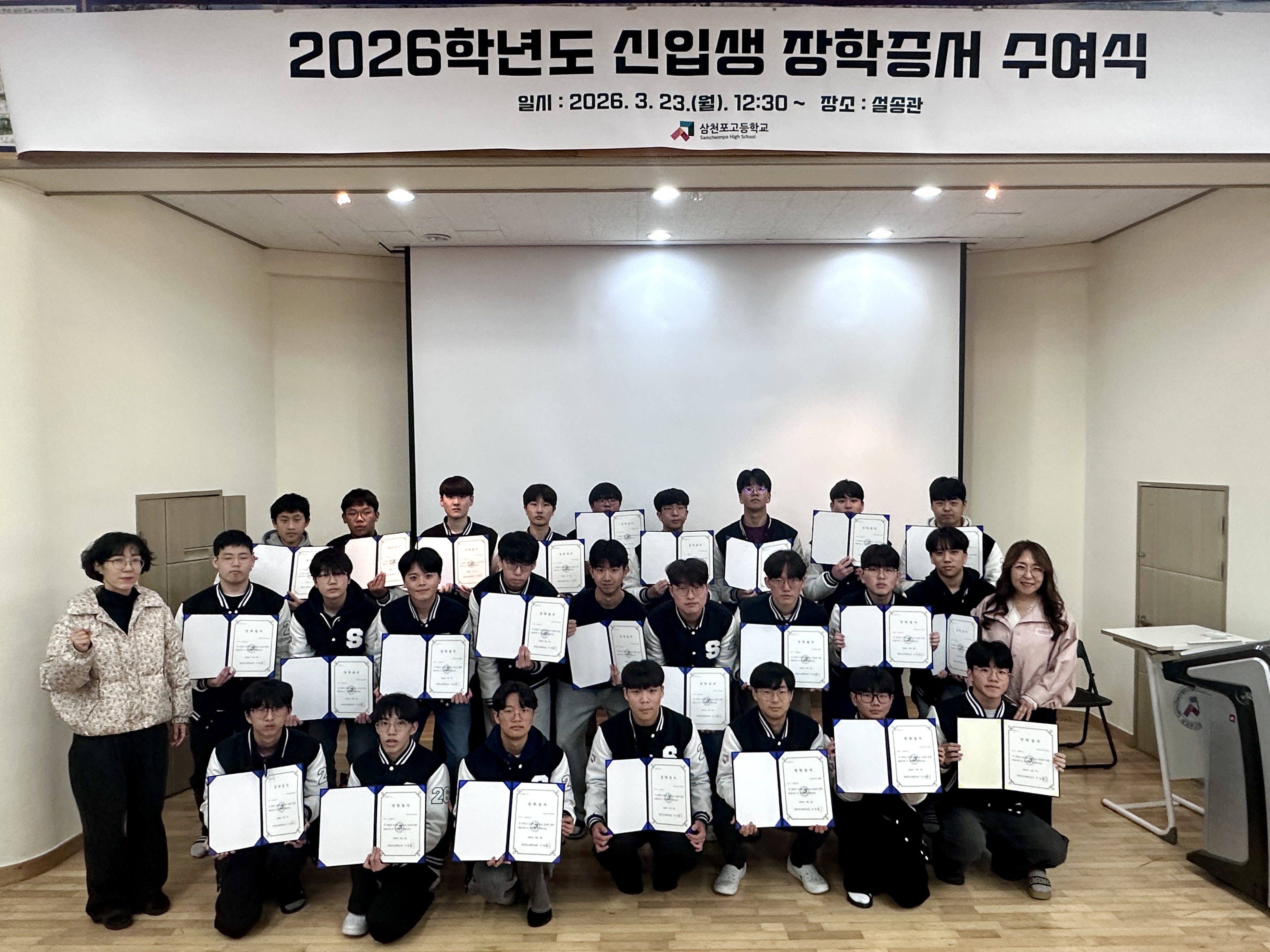 2026년 3월 23일, 삼천포고등학교(교장 서영희) 설송관에서 2026학년도 신입생 장학증서 수여식이 열렸다. 이번 장학금은 삼천포고등학교 졸업생들이 뜻을 모아 마련한 동창회 장학금으로, 신입생들의 힘찬 출발을 응원하고자 하는 의미를 담고 있다.